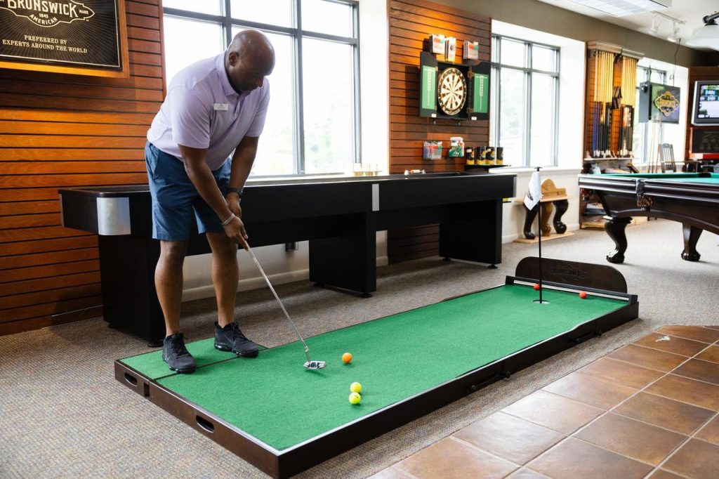 A man putting on a Maxwell Putting Green inside the Charlottesville Aquatics showroom